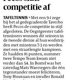 De tafeltennissers van Pecos zijn terug op het een-na-hoogste niveau. Het seizoen is nog niet voorbij, maar ze verzekerden zich zaterdag van de titel door b...