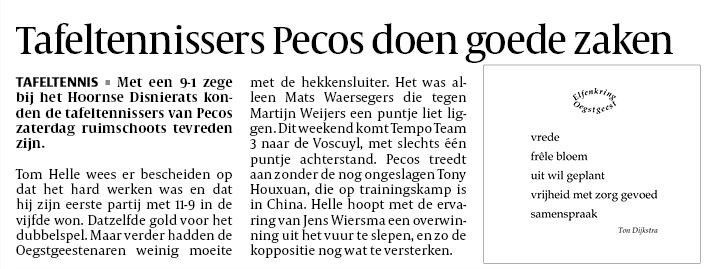 Tafeltennissers Pecos doen goede zaken Met een 9-1 overwinning op de nummer laatst heeft ons eerste team afgelopen zaterdag goede zaken gedaan. Lees hieronder meer.