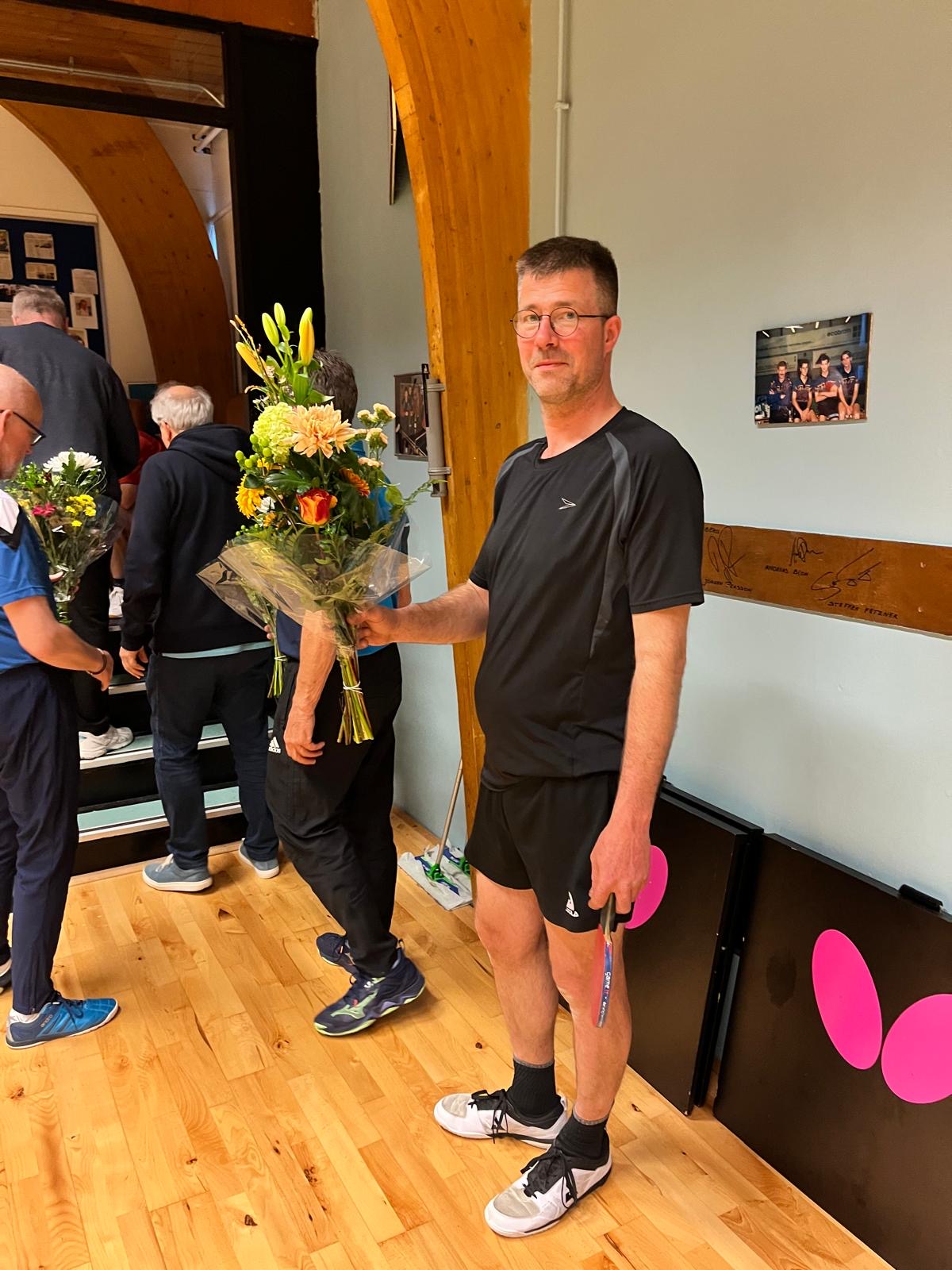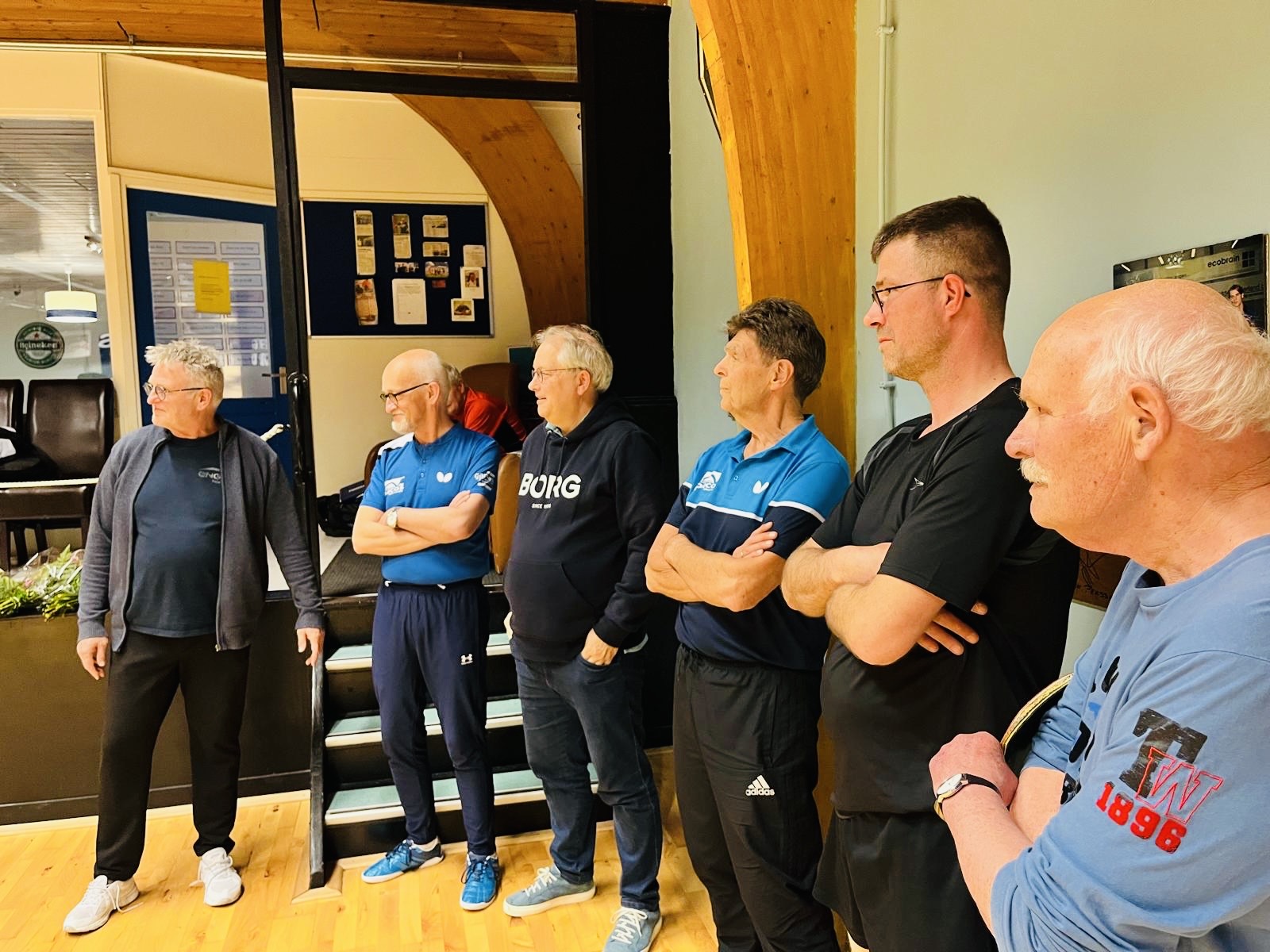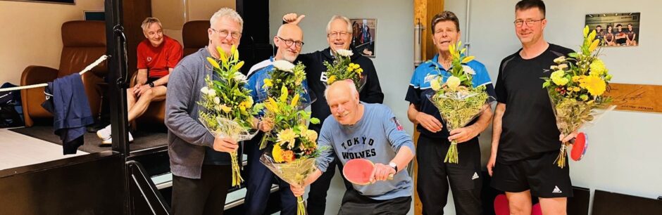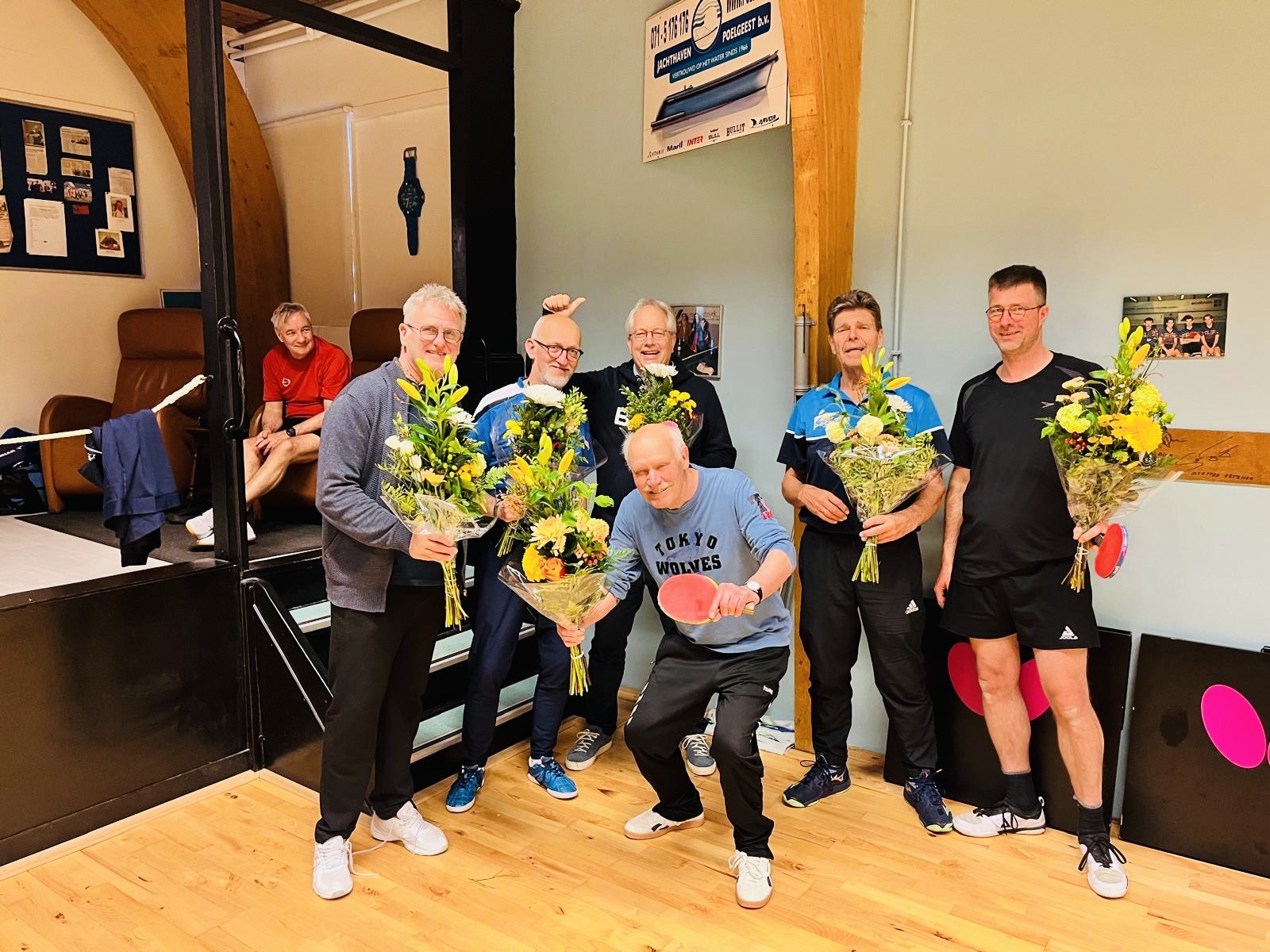 Ook dit jaar is team 4 weer kampioen geworden in de 5e klasse en gisteravond werden zij hiervoor gehuldigd onder leiding van wedstrijdsecretaris Ronald. Hij benoemde dat dit team nu al jaren jojoot tussen de 4e en 5e klasse en dat ze ondanks een stroef begin dit seizoen met een knappe 7-3 overwinning op hun concurrent Sassem het tij hebben weten te keren. Waar de mannen in hun enkelspel tussen de 3/4 en 1/3 van hun wedstrijden hebben weten te winnen, hadden ze in hun dubbel een geheim wapen aan Dick die al zijn 5 dubbels heeft gewonnen. Nu gaan ze eraan werken dat ze komend seizoen met samen met hun nieuwe versterking van Frank en Arnold hun 4e klasse plek gaan handhaven.